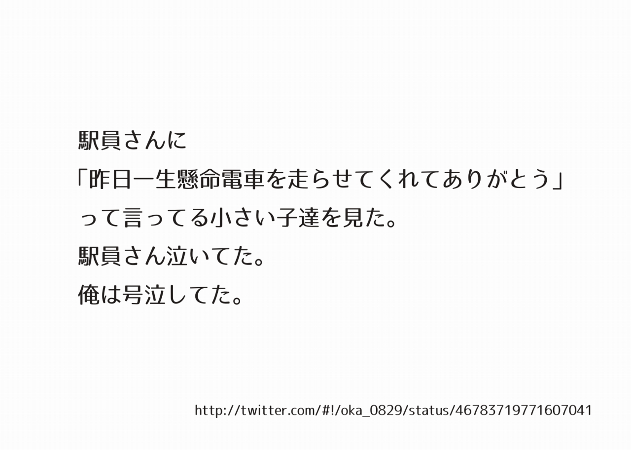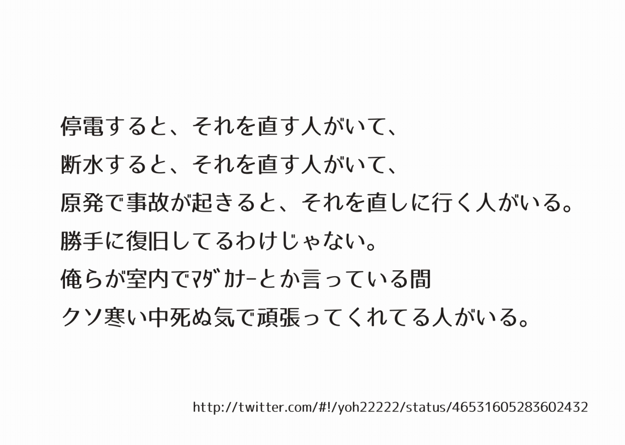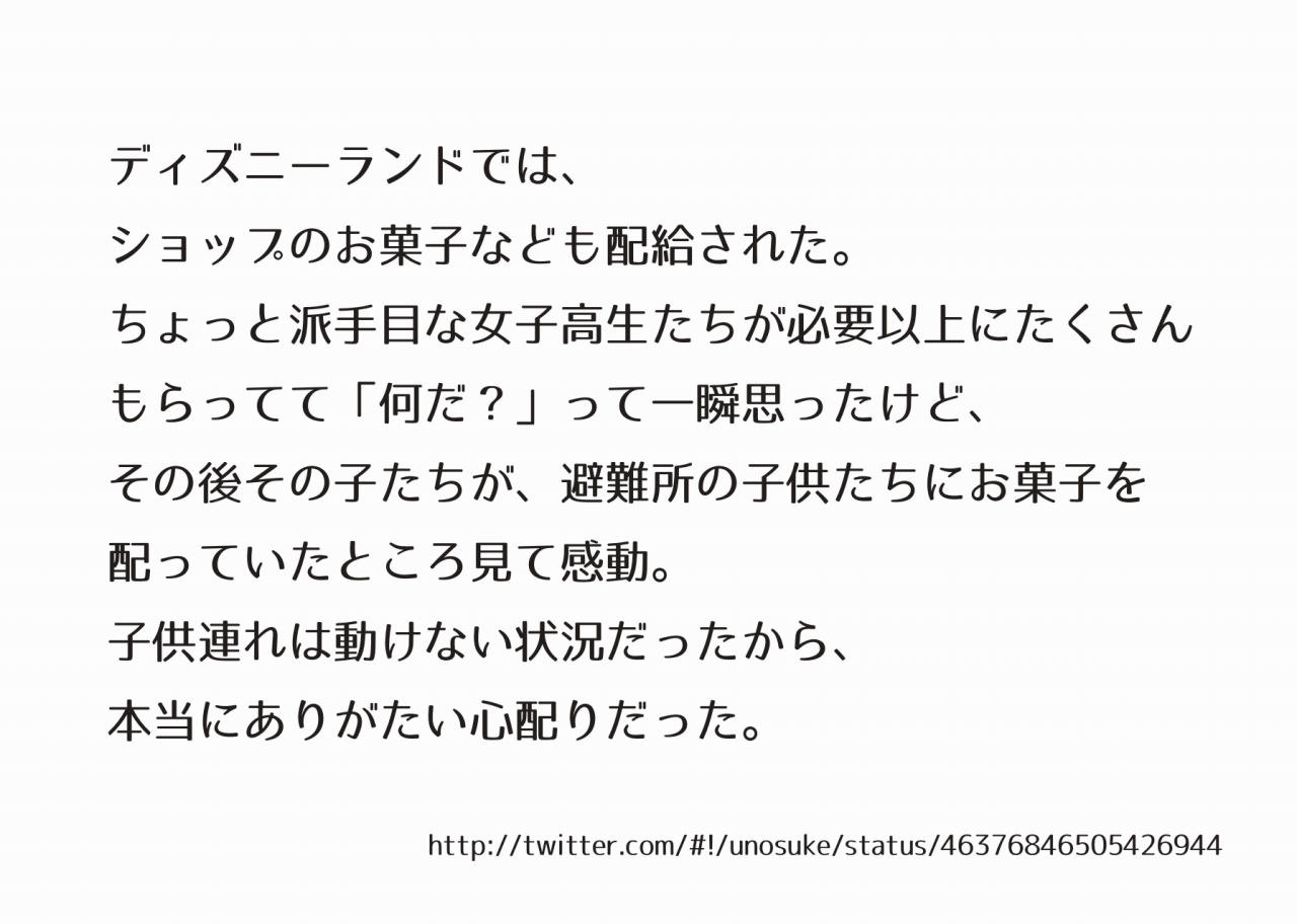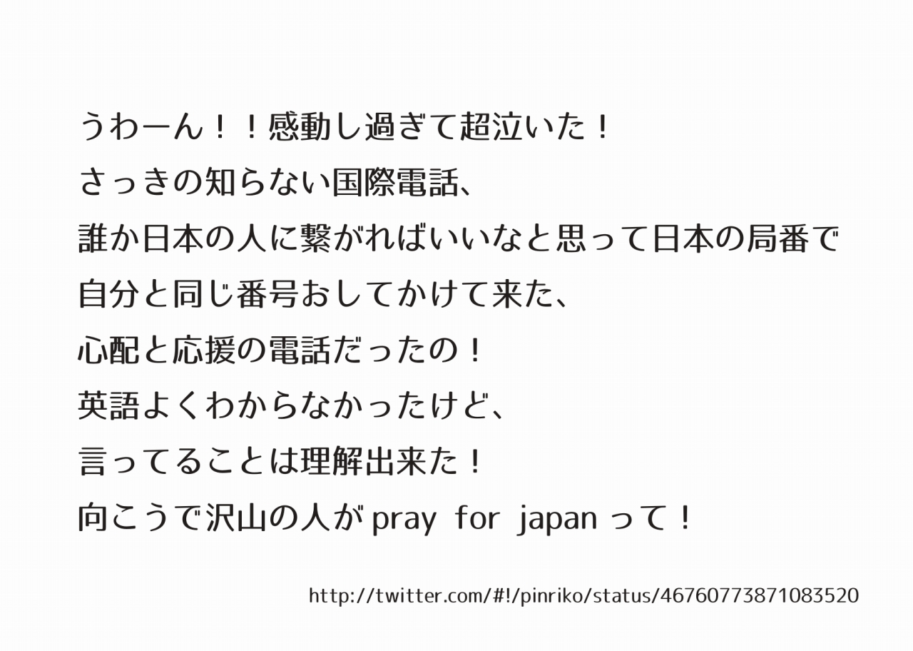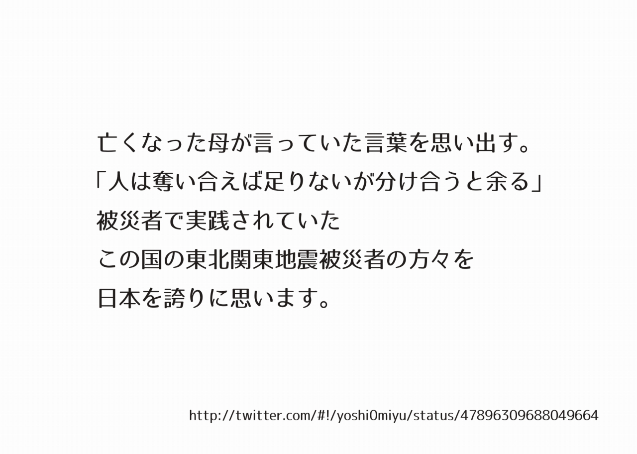 皆様ご存じのとおり、日本はこのたび東日本大震災という未曽有の災害を受けました。それは地震国に育った私たち日本人でも驚き、ショックを受けるものでした。しかし、何より驚いたことは、日本人がこんなに人の幸せや不幸に涙を流して必死になる者たちであったのだ、ということです。