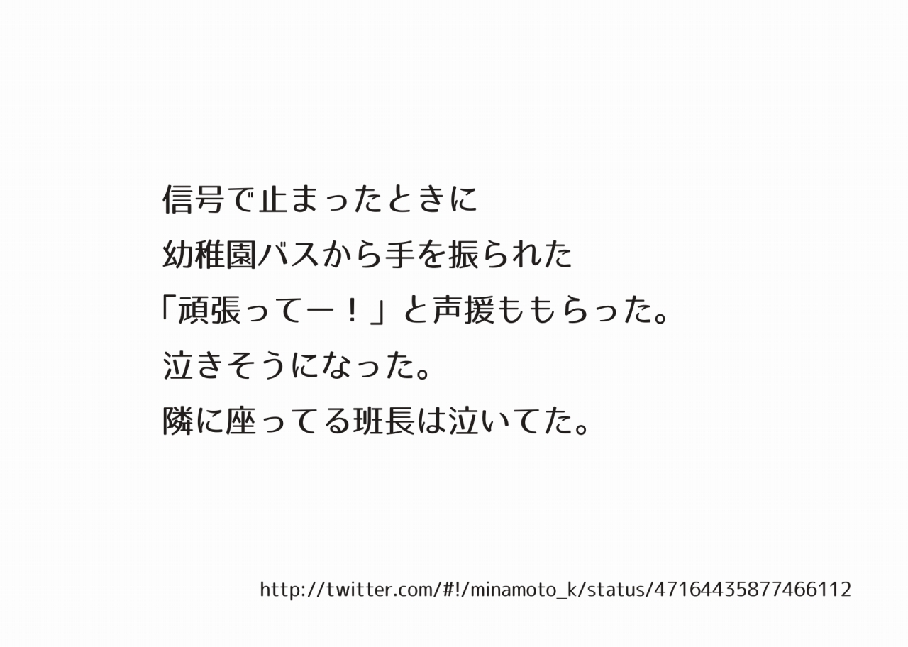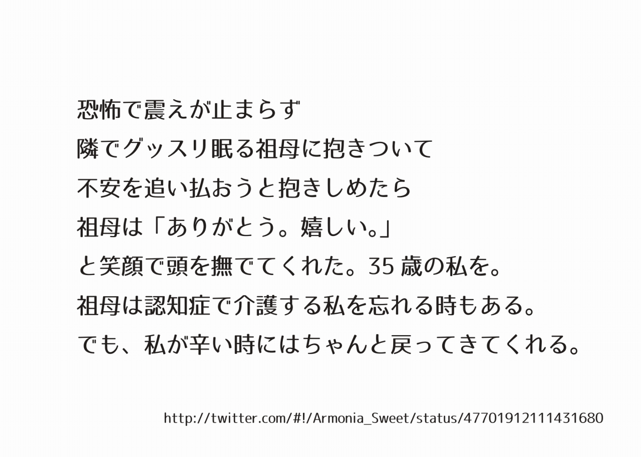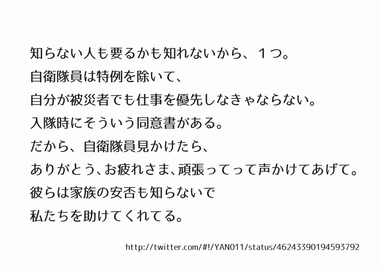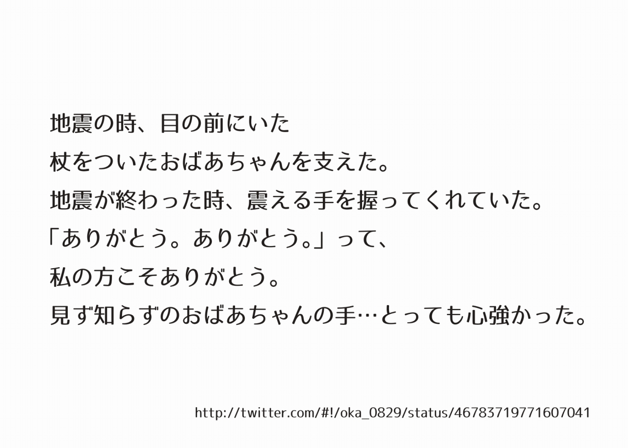 一方、日本人は古来より秩序と礼節を重んじ、調和を大切にする民族であると言われていました。今回、それがわかったように思います。日本は今、ひとつの家族になっています。他人ではなく、みな家族のように悲しみも喜びも分かち合い、復興に向けてがんばっています。親を亡くした子どもや、子どもを亡くした親も、もはや他人の話ではないのです。