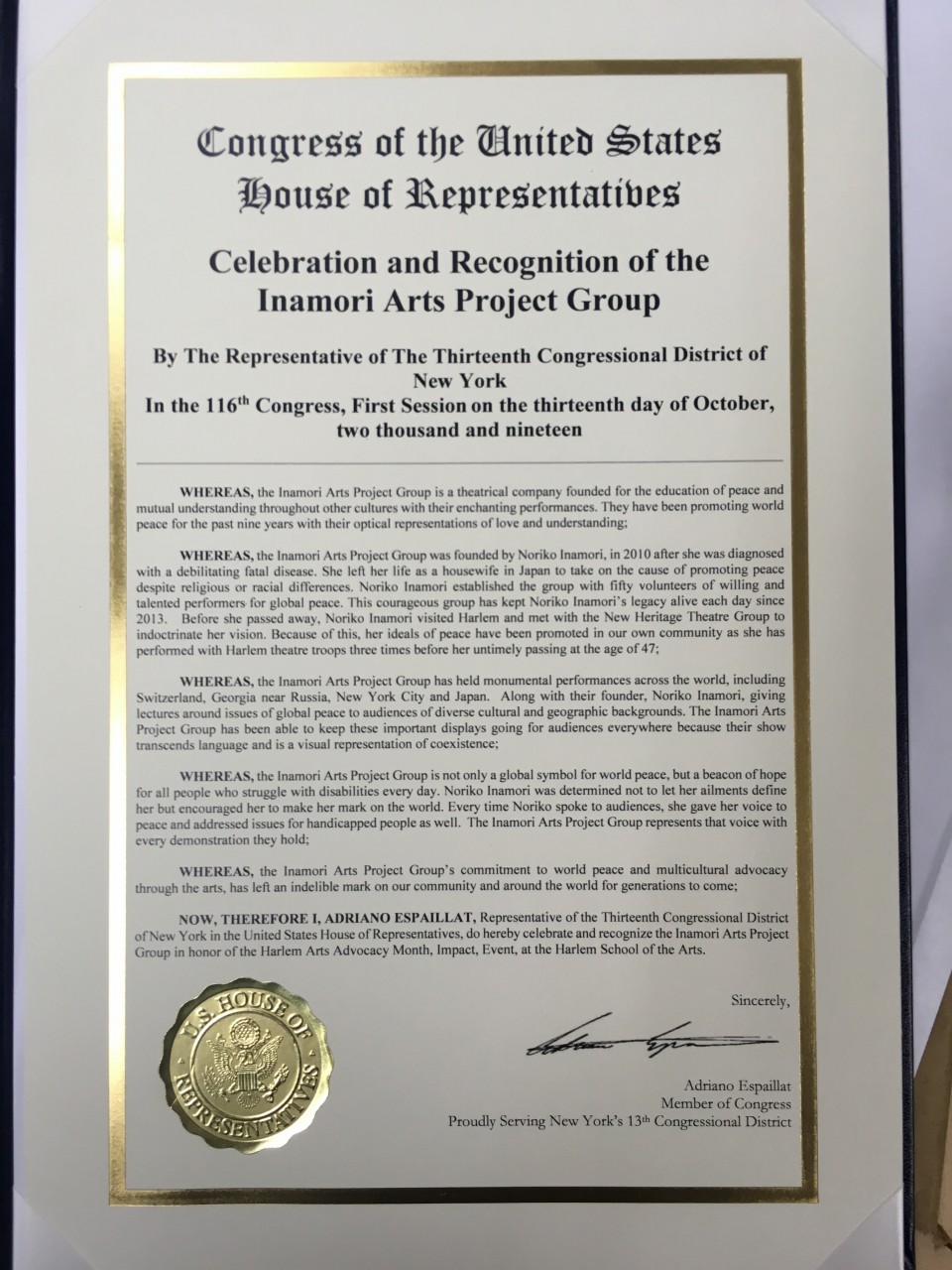 On October 13, Noriko Inamori, the founder of the IAPG as well as the IAPG received commendation from the United States Congress and New York City respectively for the art activities advocating peace in New York.