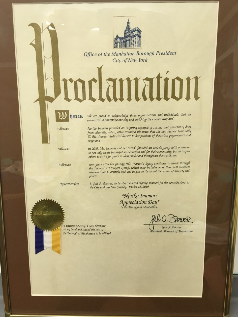 It has been 8 years since Noriko Inamori, the founder of INAMORI Art Project Group, first visited New York. She returned to heaven 6 years ago, however we are so convinced she is pleased with this honor in heaven.